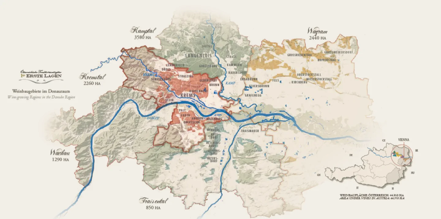 Due to its highly favorable climatic location, the Kremstal wine region offers ideal conditions for characterful, elegant white wines as well as fruitdriven, velvety red wines. Cool fallingwinds from the north, alternating with warming Pannonian influences from the east, create a unique climatic framework, regulated by the Danube.